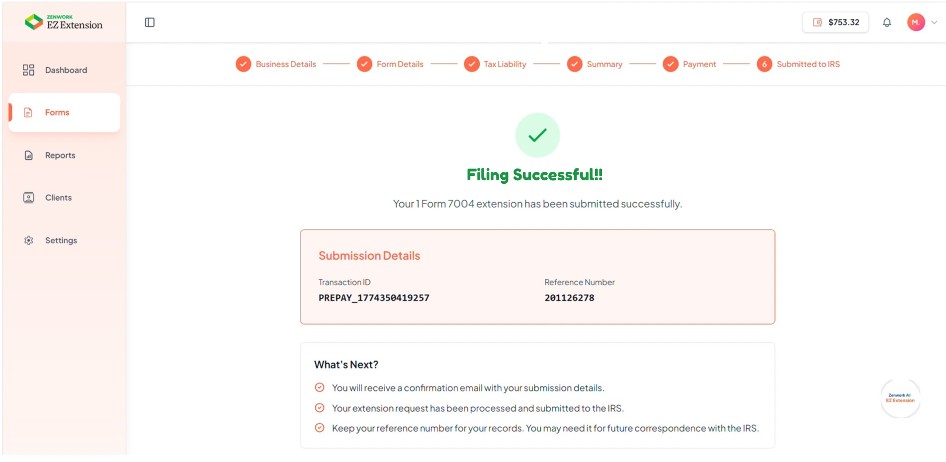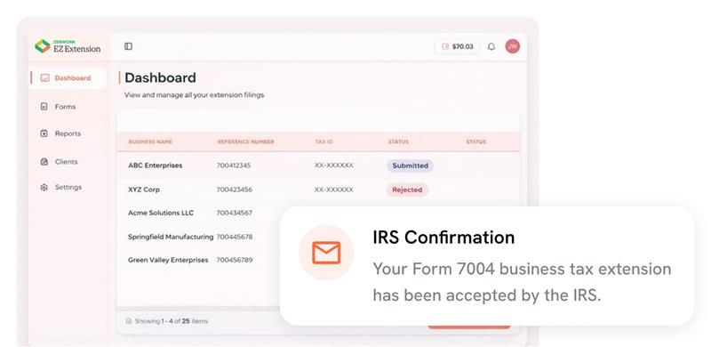 A simple guided flow for Form 4868 and Form 7004, from selection to submission.