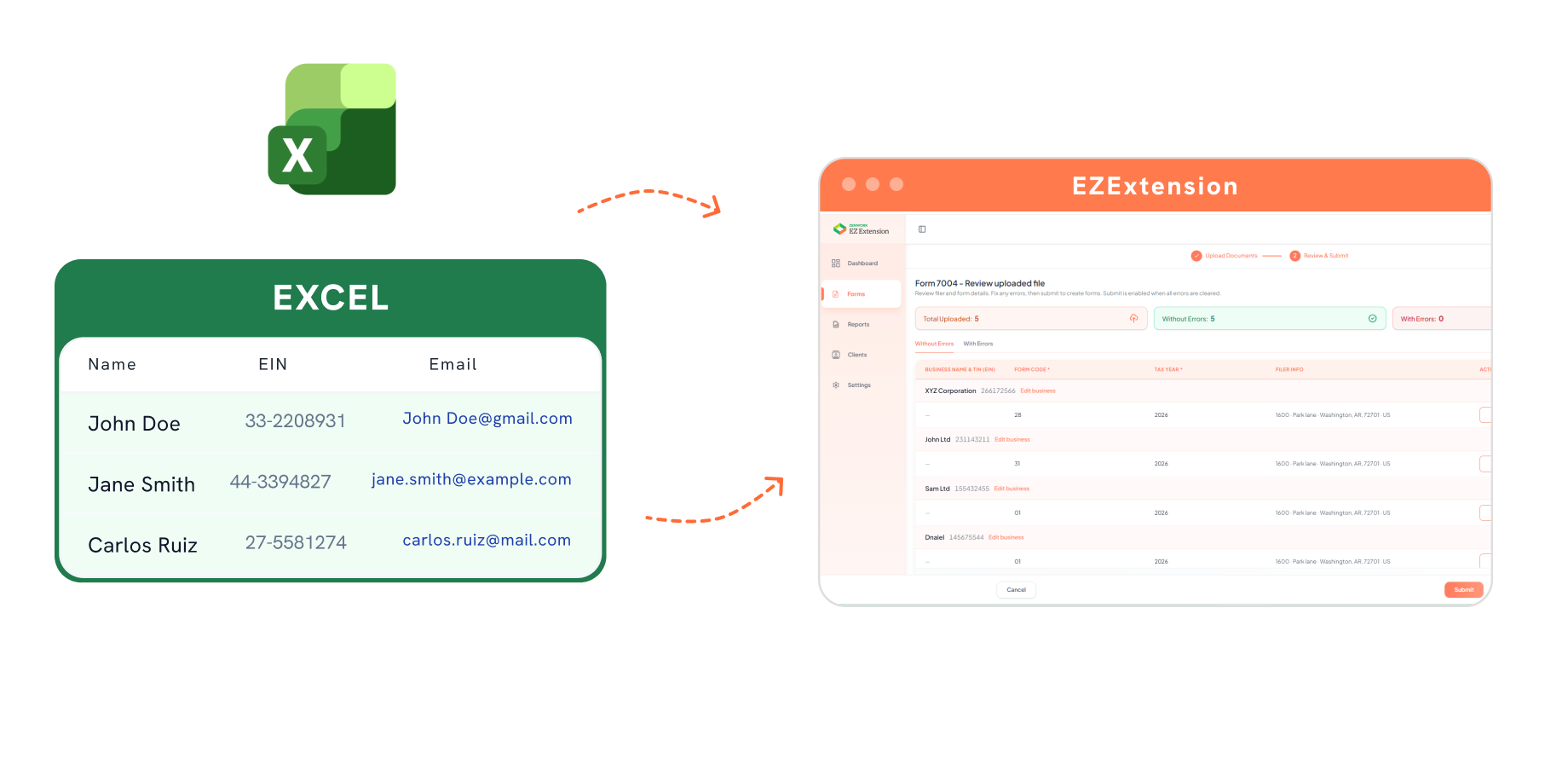 Stop filing one at a time. Upload your client list, auto-populate forms, and submit hundreds of tax extensions in minutes - not days. Perfect for CPAs, EAs, and tax firms managing large client portfolios.