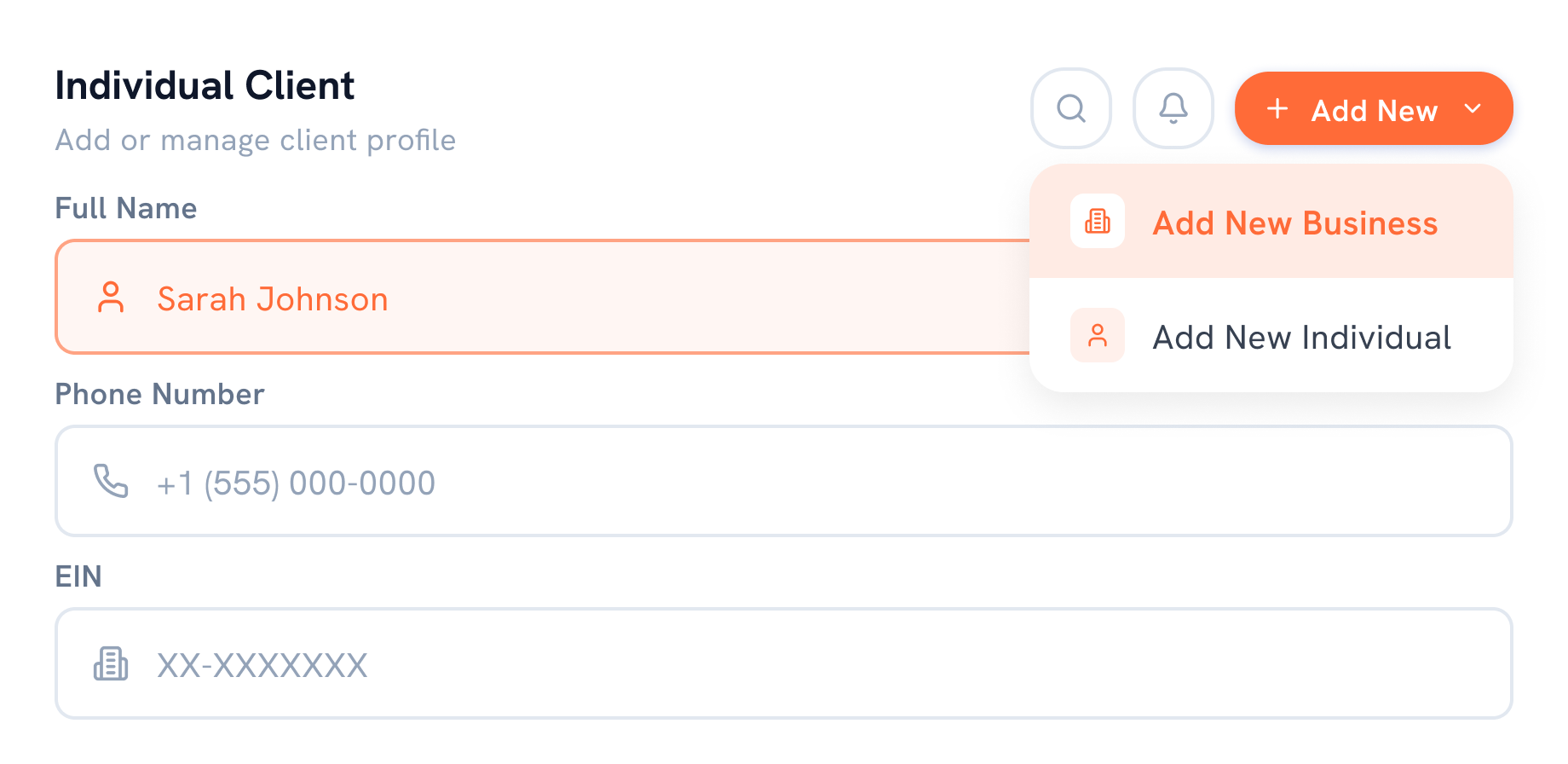 Store and manage your clients information for businesses and individuals in one place to be reused without manual re-entry.