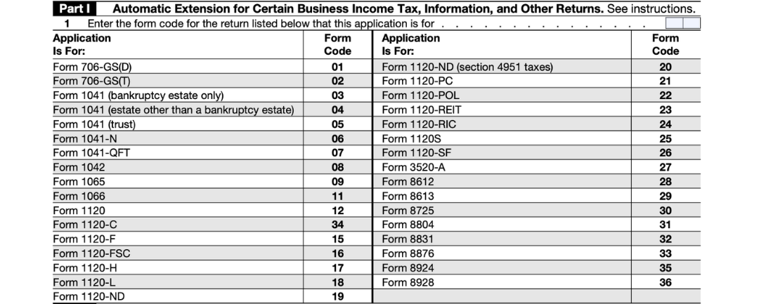 - LLC electing to be a C-Corps: For LLCs electing to be C-corps has to file Form 1120. They use Code 12 in Part 1 of Form 7004 to file an extension
